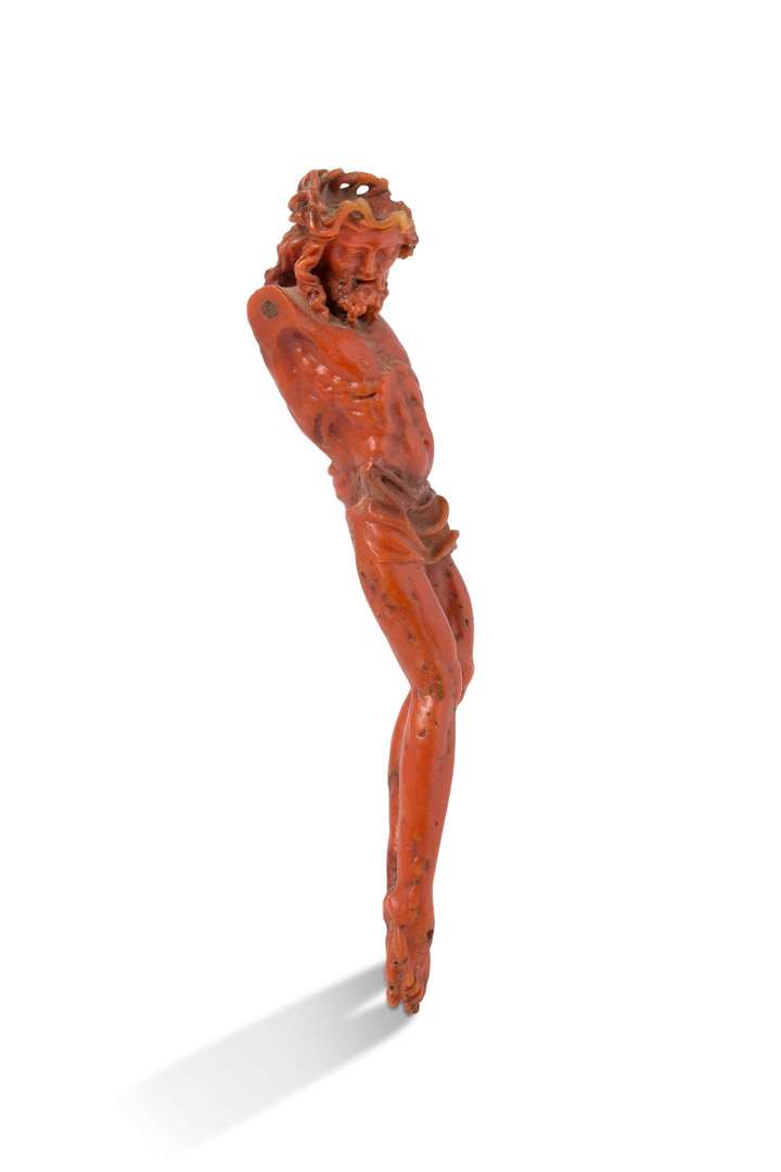 ~ Christ en corail rouge finement sculpté de deux pièces, tel crucifié.