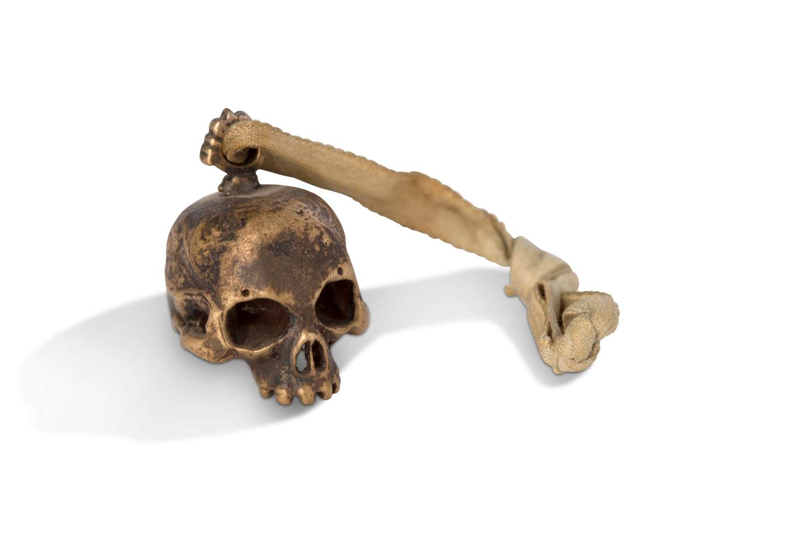 Petit crâne «Memento mori» en bronze à patine nuancée, gravé de rinceaux et surmonté d'un anneau de suspente.