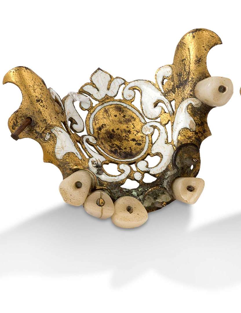 Dentier dit aussi voûte palatine en alliage cuivreux doré et partiellement émaillé de blanc en champlevé, cinq dents scellées.