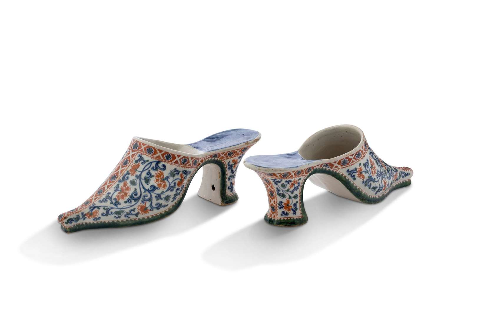 Paire de souliers en faience polychrome.