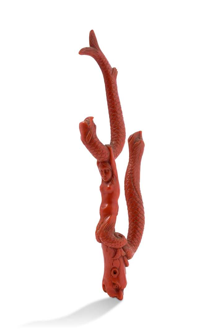 ~ Branche de corail rouge entièrement sculptée d'une sirène chimérique tenant au dessus de sa tête un long poisson aux côtés d'un serpent des mers sinueux. D'une tête de léopard stylisée partent les restes d'une ancienne monture avec une petite virole de bronze doré.
