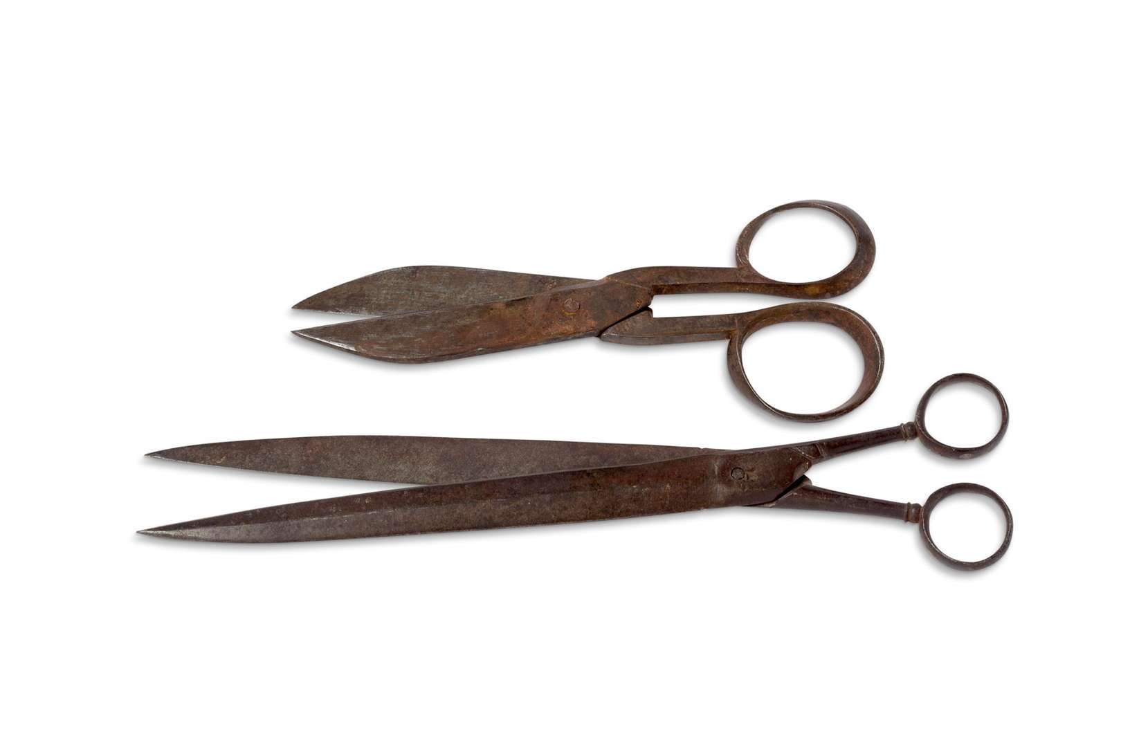 Deux paires de ciseaux dont une de drapier en fer forgé.