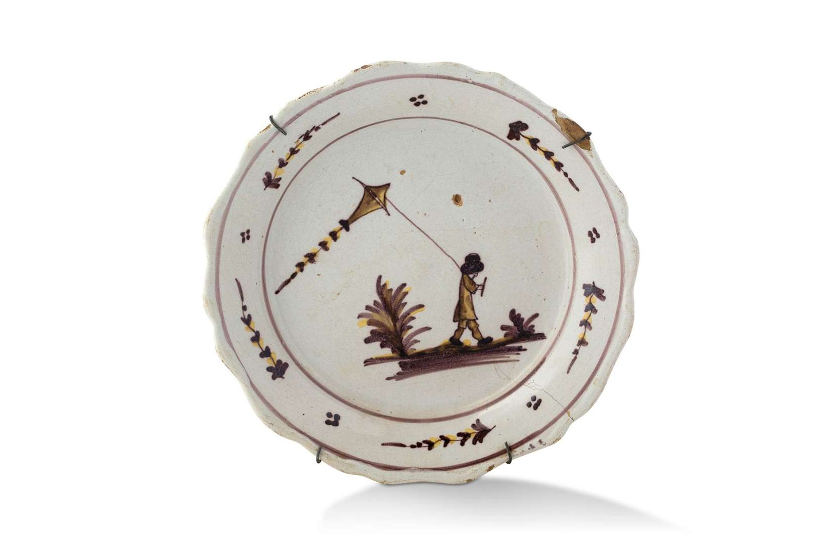 Rare assiette à bords contournés en faïence à décor en violet de manganèse et jaune de l'expérience du cerf-volant de Benjamin Franklin sur la nature électrique des éclairs.