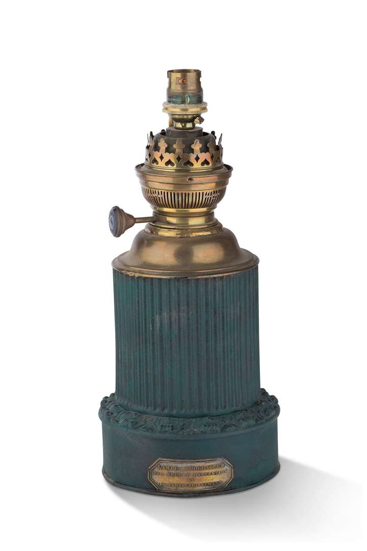 Lampe à huile à modérateur montée à l'électricité le fût en tôle laquée bleu / vert formant colonne cannelée.