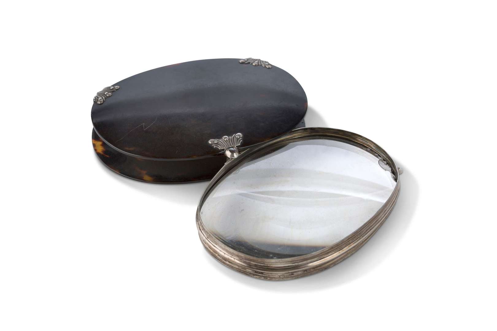 ~ Importante loupe ovale coulissante en écaille et métal argenté.