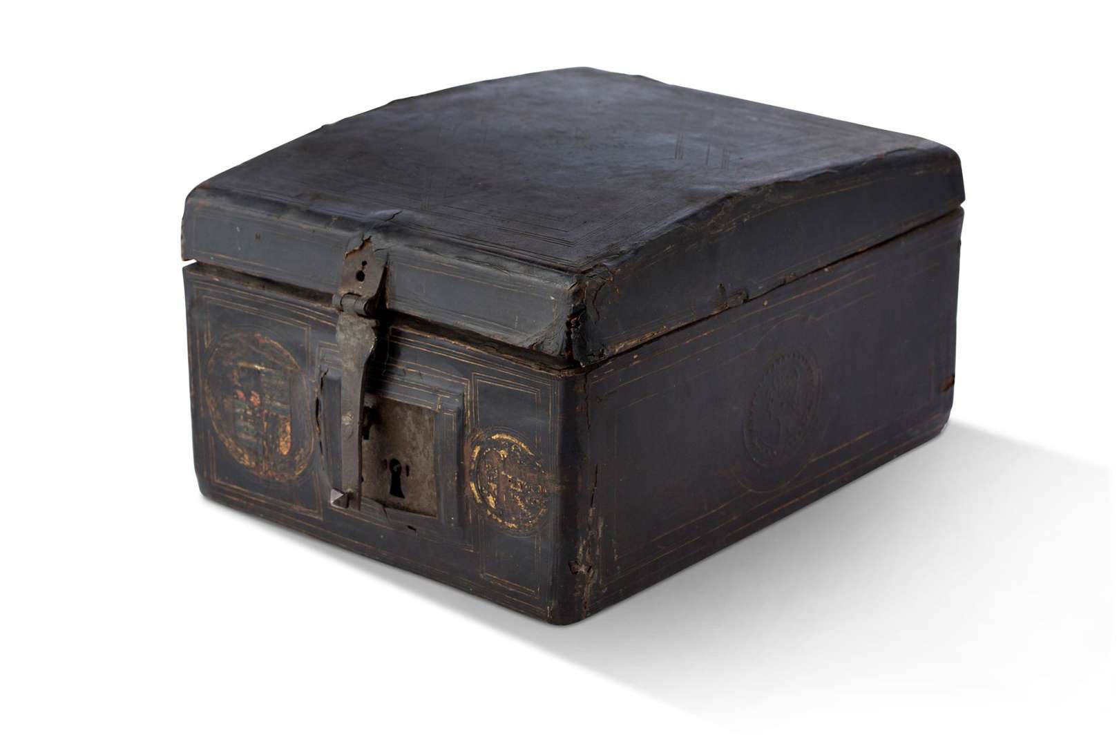 Coffret dit «de messager» en bois gainé de cuir à décor d'armoiries et d'un profil d'homme, la serrure à moraillon en fer forgé.