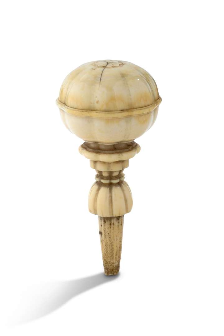 ~ Pommeau de canne en ivoire sculpté et tourné, le couvercle dévissable co