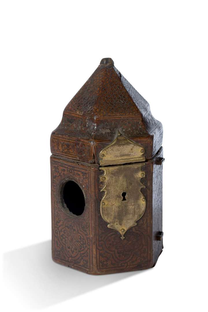 Étui d'horloge de table à pans en cuir brun à décor estampé aux fers de rinceaux feuillagés, couvercle pyramidal, garnitures en laiton doré.
