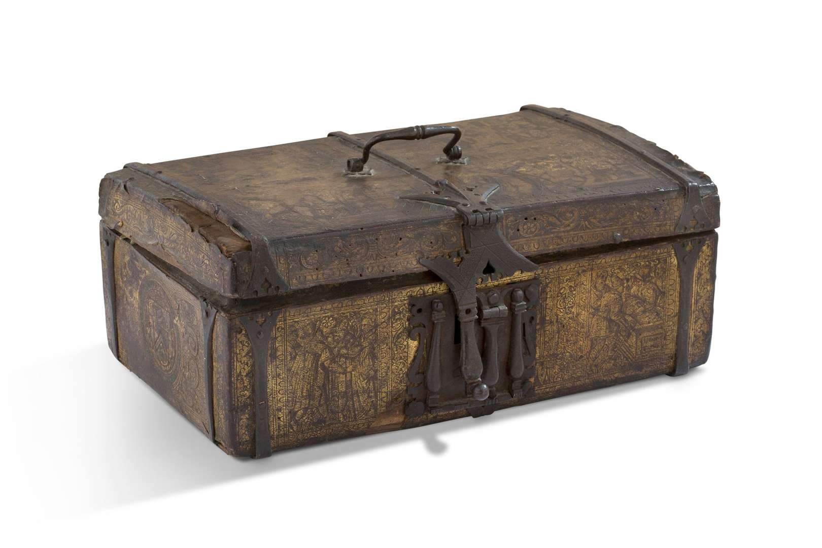 Coffre de voyage rectangulaire à âme en bois gainé de cuir anciennement doré, pentures en fer forgé et serrures à moraillon, à décor toutes faces de l'histoire de Ruth et Booz, armoiries et rinceaux.