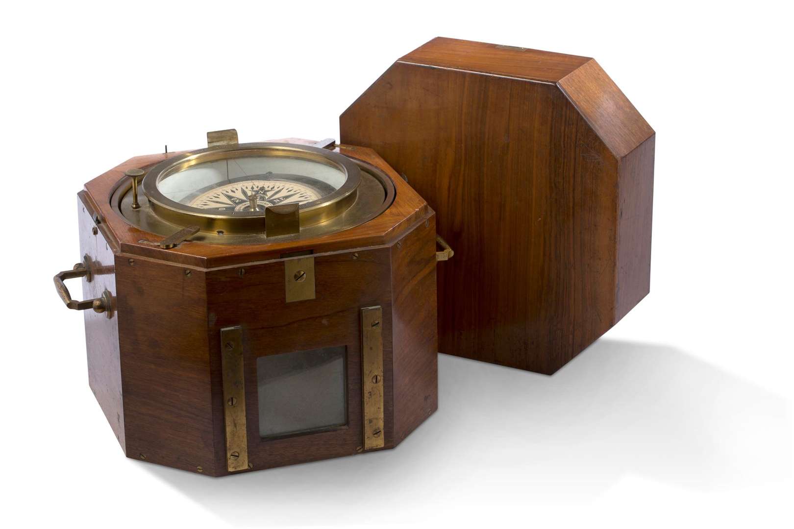Compas de marine en laiton dans sa boîte octogonale en acajou, signé «Inventée par Emile Duchemin / n°24783»