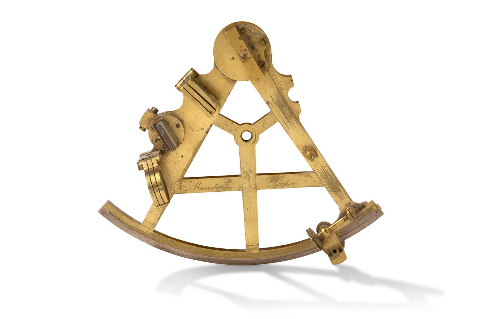 Sextant en laiton signé «Ramsden London», le limbe gradué de 0 à 130°, la poignée en bois.
