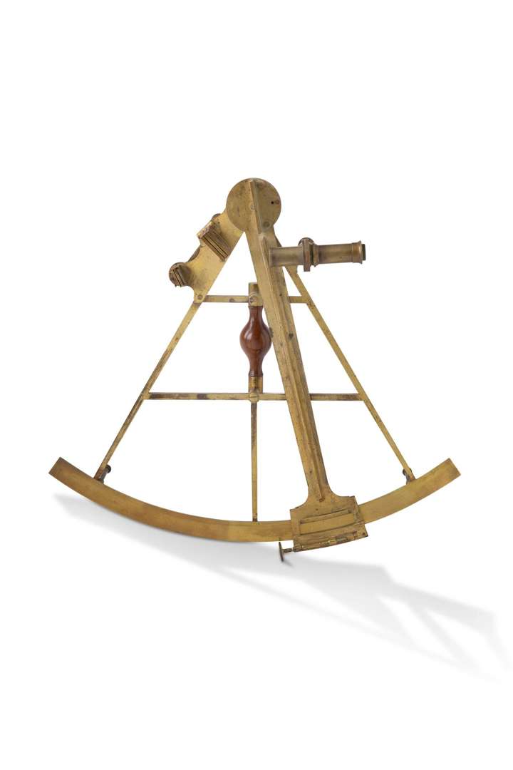 Sextant en laiton le limbe gradué de 0 à 125° et signé «Lenoir à Paris», la poignée en acajou tourné.