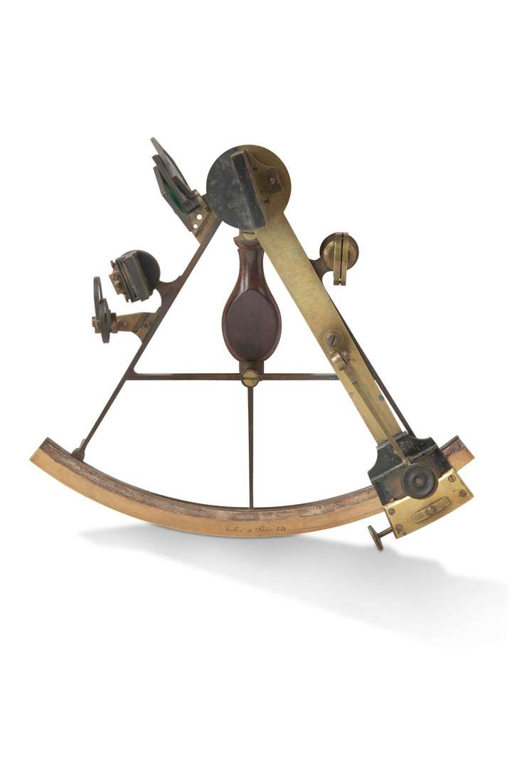 Sextant en laiton le limbe gradué de 0 à 140° et signé «Jecker à Paris. 334», la poignée en acajou.