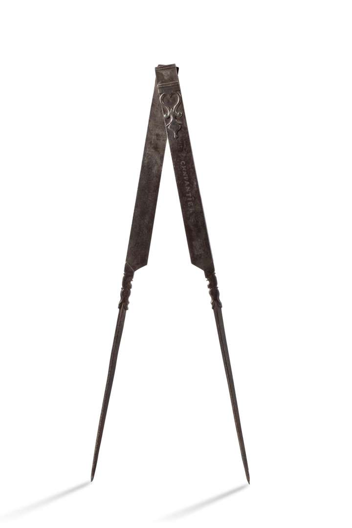 Grand compas d'épure de compagnon charpentier en fer forgé, signé