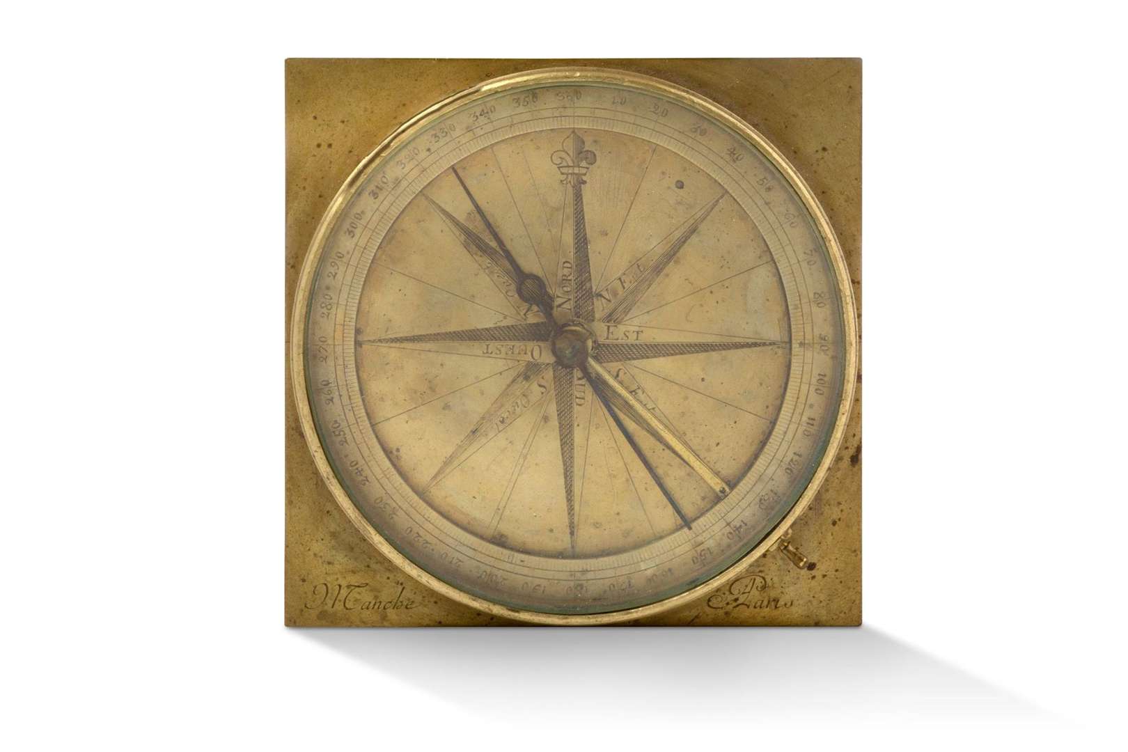 Boussole d'arpenteur en laiton gravé signée «Manche à Paris».