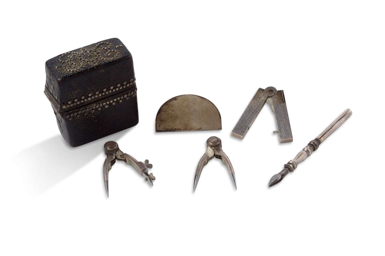 Nécessaire d'architecte miniature en argent et métal constitué d'un rapporteur, un porte-mine, deux compas et un compas de proportion signé «Delure Paris».
