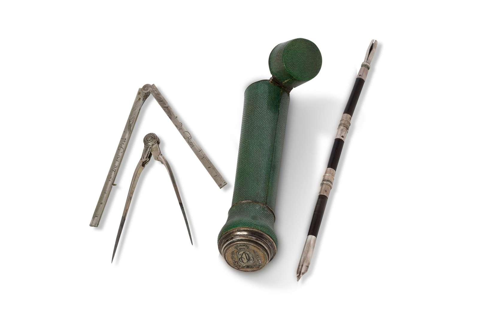 Nécessaire d'écriture dit «Baradelle» en argent et métal comprenant un porte mine, un compas et un demi pied de Roy gravé et ciselé. L'écrin en galuchat vert terminé par un encrier dévissable présentant un sceau à cacheter monogrammé.