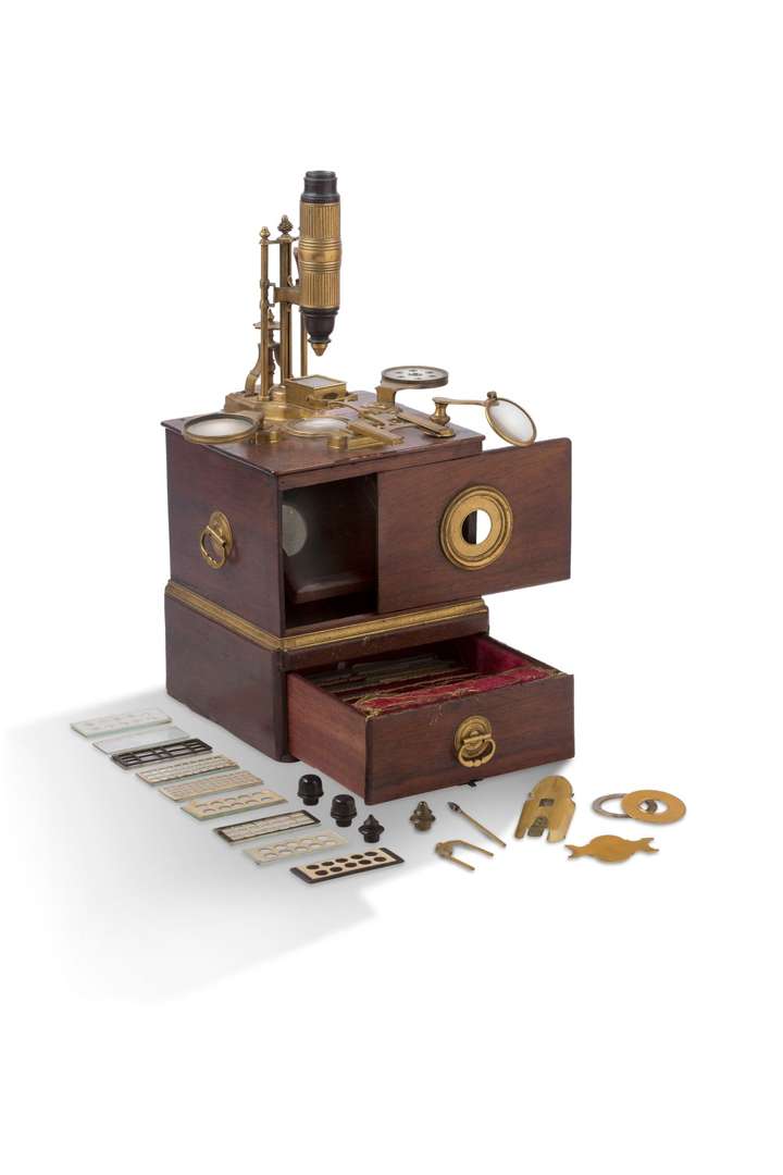 Microscope composé à boîte de type Marie en laiton doré, le socle cubique en acajou ouvrant à un tiroir contenant divers accessoires et objectifs de rechange.