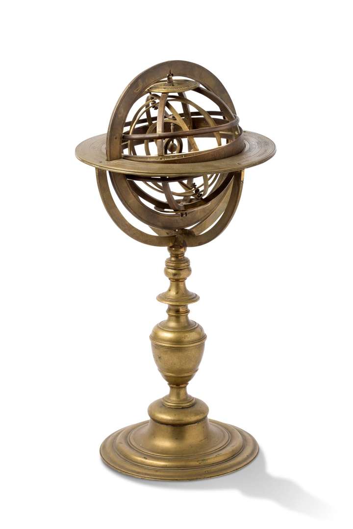 Sphère armillaire en laiton doré et gravé reposant sur un pied balustre an