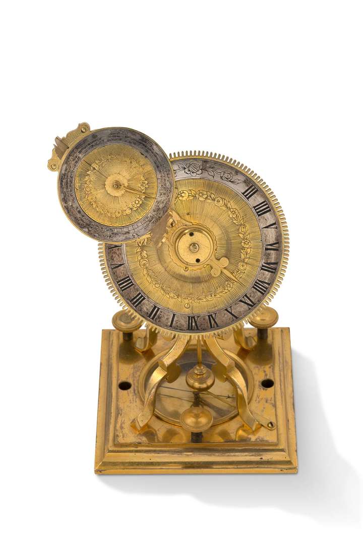Chronomètre solaire équinoxial mécanique dit cadran «minute» en laiton doré, argent, acier et verre, gravé d'un décor de couronnes de fleurs, les quatre pieds à courbes et contre-courbes reposant sur un socle carré à trois vis comprenant une boussole. Le dos de la platine présentant les latitudes des principales villes européennes.