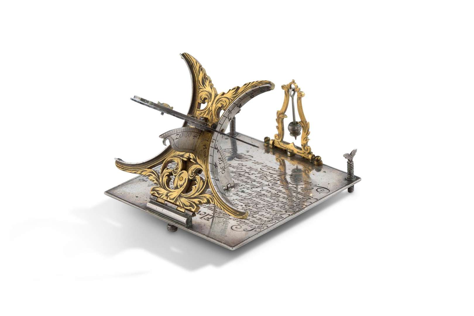Cadran solaire équinoxial en argent et laiton doré, l'index et le fil à plomb rabattables gravés de rinceaux ajourés affrontés, la platine carrée signée «Johann Martin in Augsburg», gravée des latitudes de villes européennes, et arborant un calendrier perpétuel au revers.