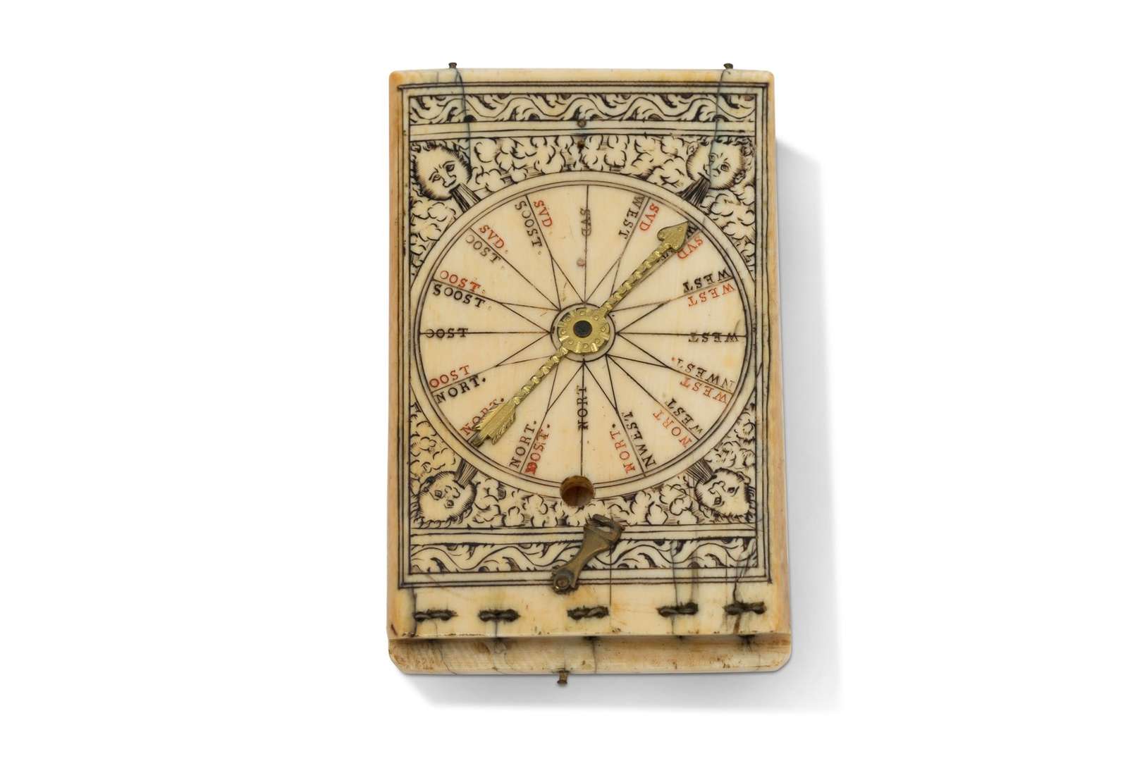 ~ Cadran solaire diptyque rectangulaire en ivoire à fil-axe la table verticale gravée d'une rose des vents aux putti souffleurs, l'intérieur signé «Pafper Milner» et gravé des signes du zodiaque, la table horizontale animée d'une boussole, le revers présentant un calendrier perpétuel avec roue en laiton doré.