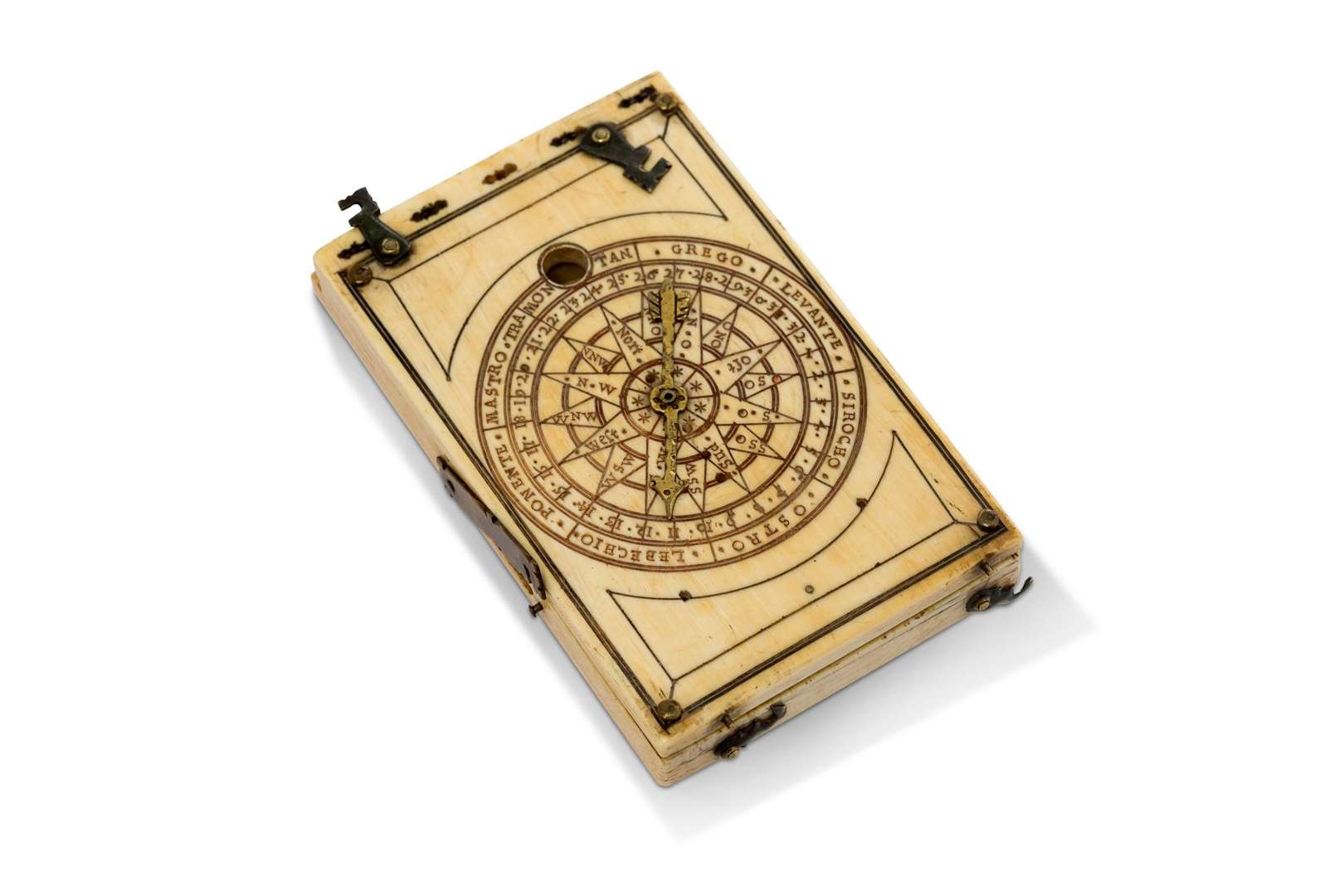 ~ Cadran solaire diptyque rectangulaire en ivoire à fil-axe, à décor gravé en polychromie, la table verticale présentant une rose des vents, l'intérieur orné des signes du zodiaque et des latitudes de villes européennes, la table horizontale à boussole comportant trois cadrans solaires, le cadran des grosses heures daté «1652», le revers présentant un calendrier perpétuel avec roue en laiton, monogrammé des lettres «NM» centrées d'une couronne.