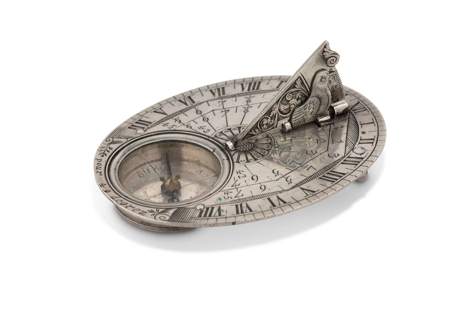 Cadran solaire portatif horizontal en argent la platine ovale à trois divisions horaires gravée d'un tournesol en son centre, gnomon à l'oiseau, le dos gravé des latitudes de villes européennes et signé «Pierre Sevin à Paris», la boussole à quatre directions.