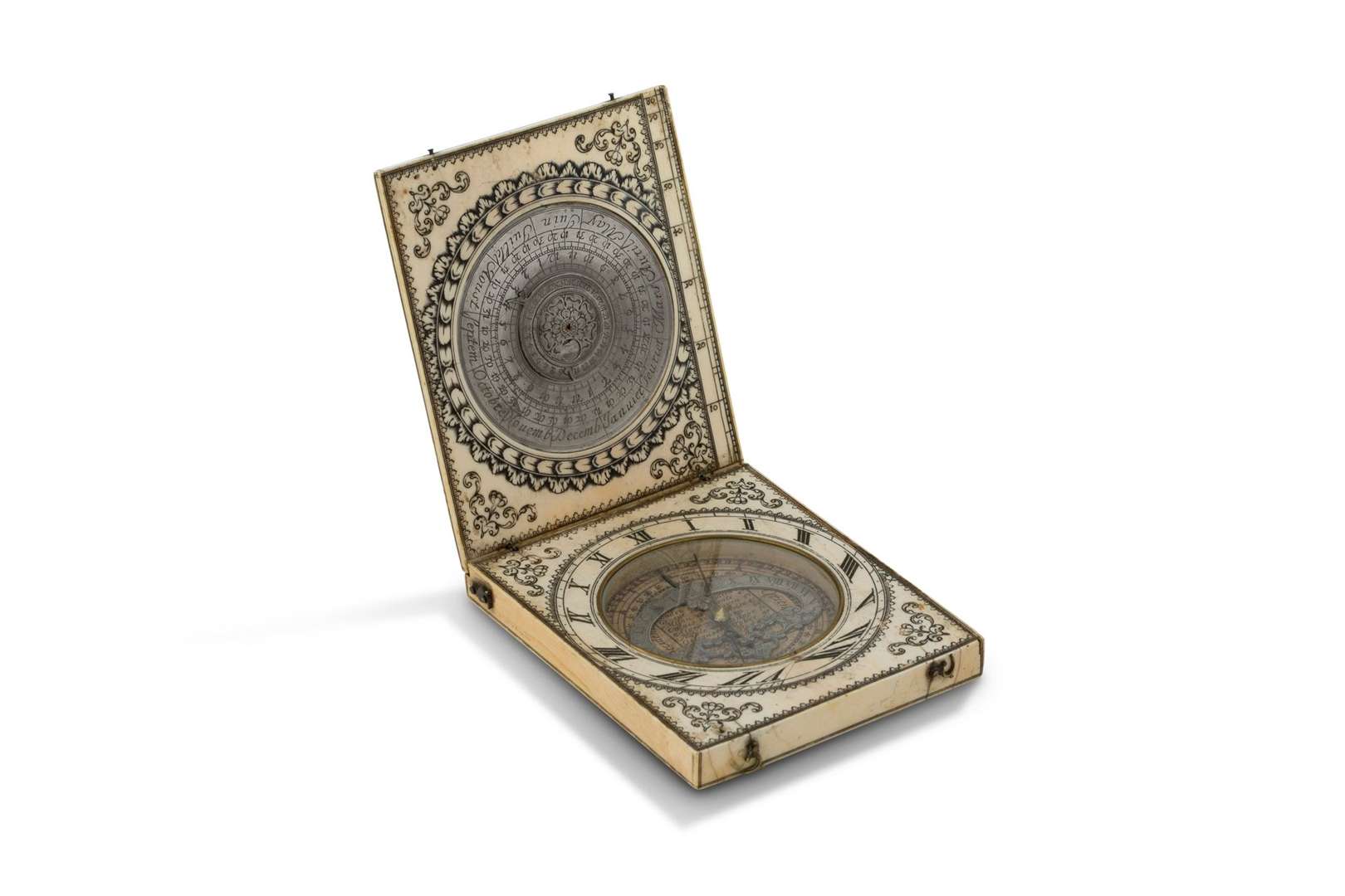 ~ Grand cadran solaire diptyque analemnatique rectangulaire en ivoire, la table verticale gravée de rinceaux, la table horizontale animée d'une boussole et ornée au revers d'un calendrier perpétuel et une table des marées signée «C. Bloud à Dieppe».