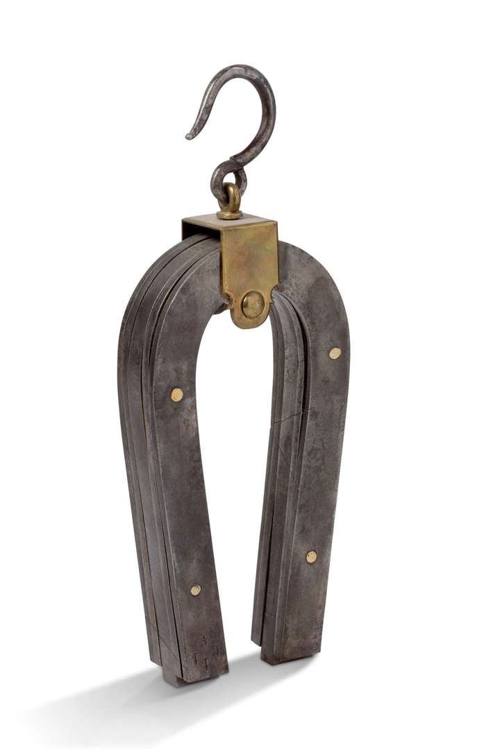 Aimant artificiel en fer à cheval composé de cinq lames, la monture en laiton à crochet de suspension.