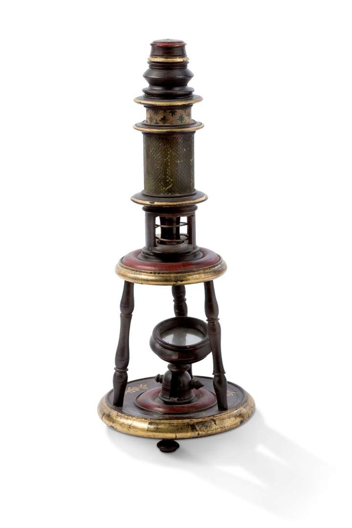 Microscope composé de type Culpeper en bois tourné et papier imprimé façon galuchat, la base circulaire à décor de branches fleuries reposant sur trois pieds en boules aplaties.