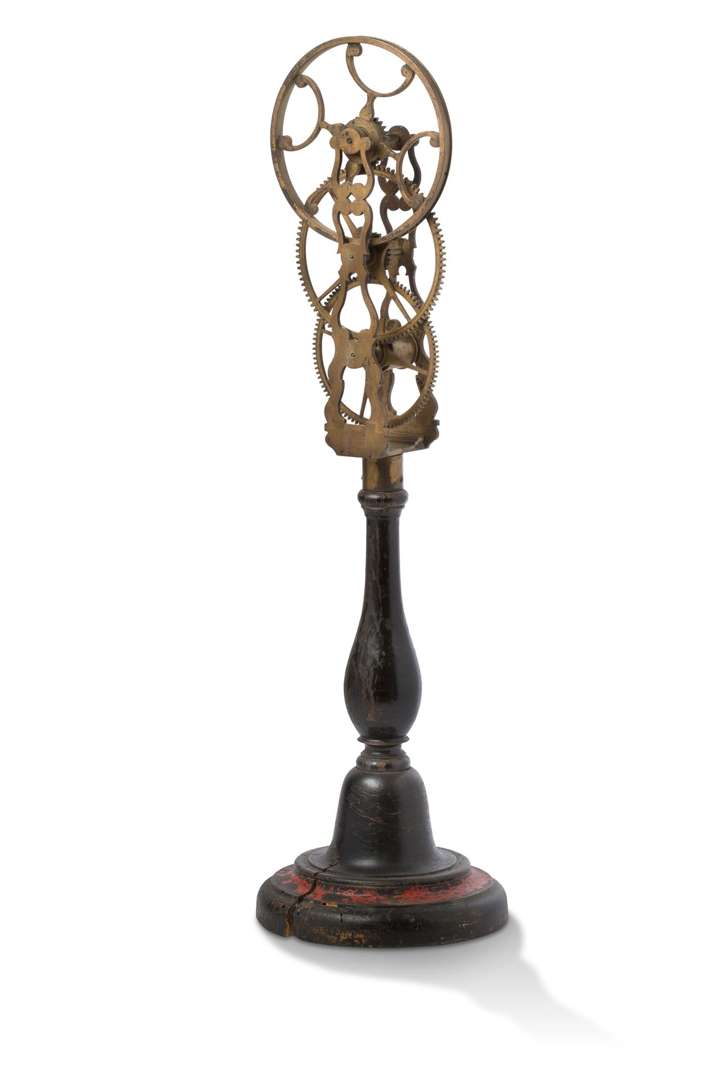 Instrument du type de l'Abbé Nollet en laiton constitué de trois roues crantées sur un pied balustre en bois tourné.