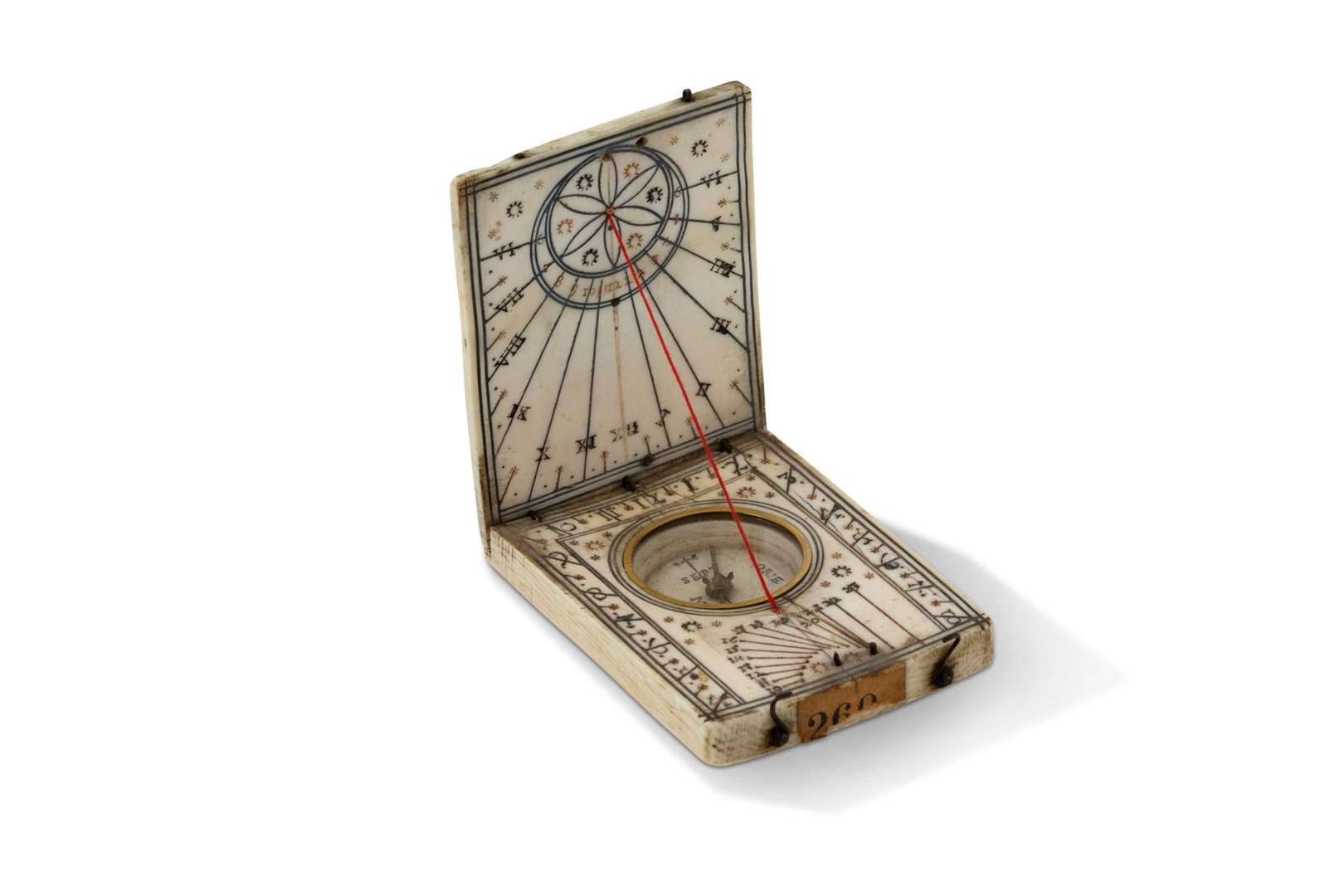 ~ Cadran solaire diptyque rectangulaire en ivoire, la table verticale gravée d'un calendrier perpétuel, la table horizontale animée d'une boussole.