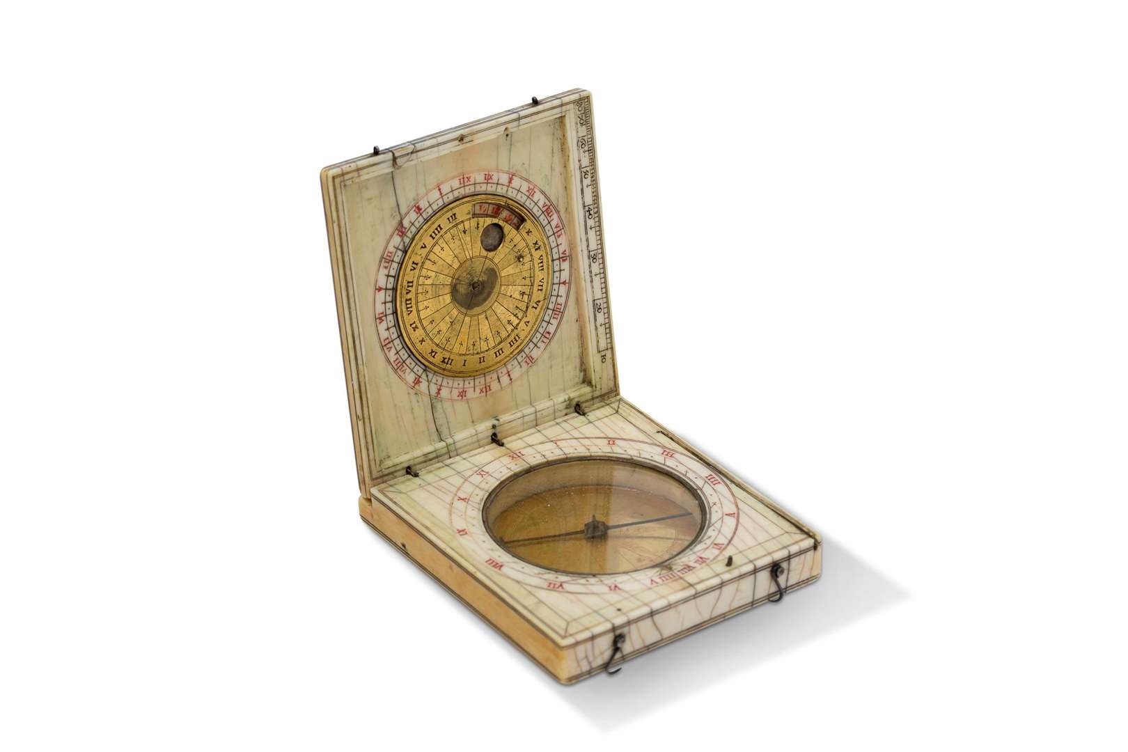 ~ Cadran solaire diptyque rectangulaire en ivoire, la table verticale présentant à l'intérieur un cadran à pièce mobile, la table horizontale animée d'une boussole en laiton doré.