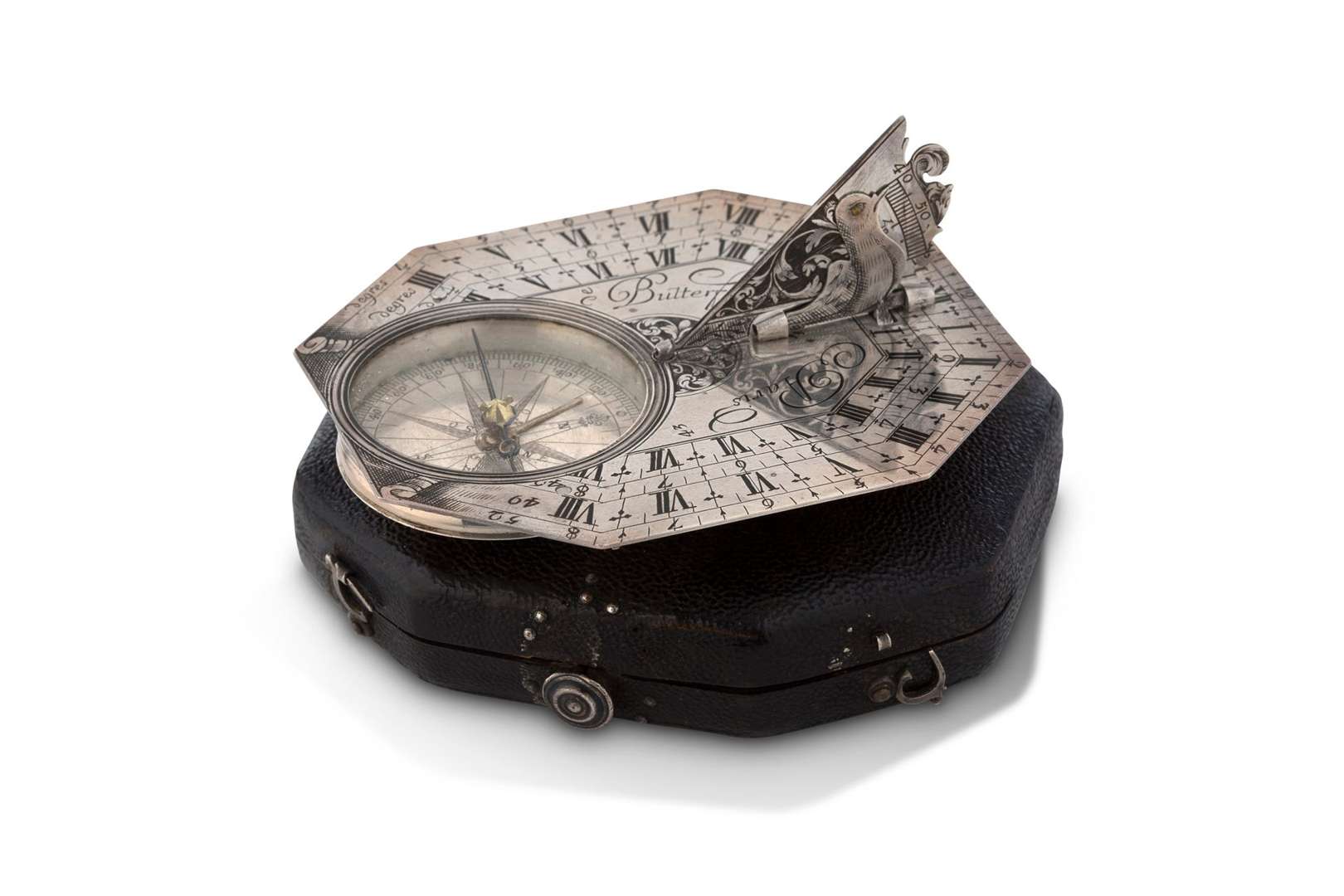 Cadran solaire portatif horizontal en argent la platine octogonale à quatre divisions horaires gravée de rinceaux en son centre et signée «Butterfield à Paris», gnomon à l'oiseau, le dos gravé des latitudes de villes européennes, la boussole à huit directions, le nord indiqué par une fleur de Lys.