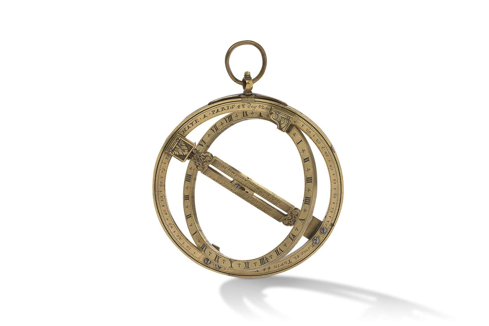 Anneau astronomique équinoxial à deux cercles en laiton à décor gravé de rinceaux feuillagés et palmettes, signé «Haye A Paris», anneau de suspente.