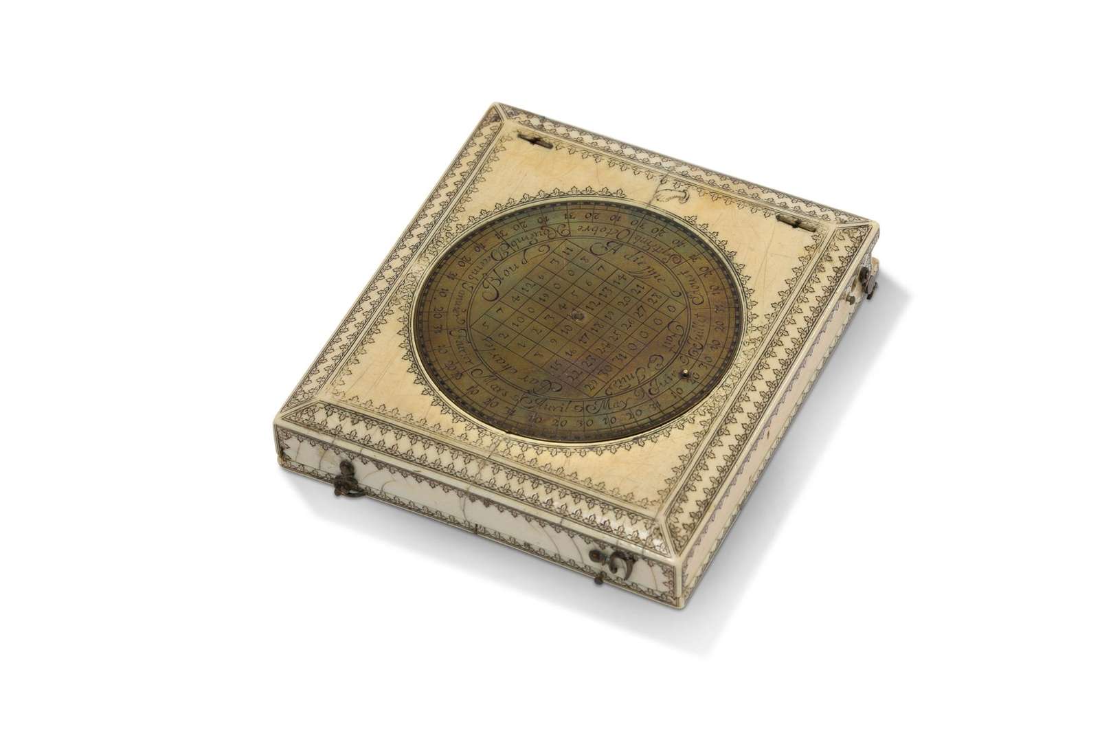Cadran solaire portatif horizontal en laiton doré la platine ovale à quatre divisions horaires gravée de rinceaux en son centre, gnomon à l'oiseau, le dos gravé des latitudes de villes européennes et d'un paysage au château «Les