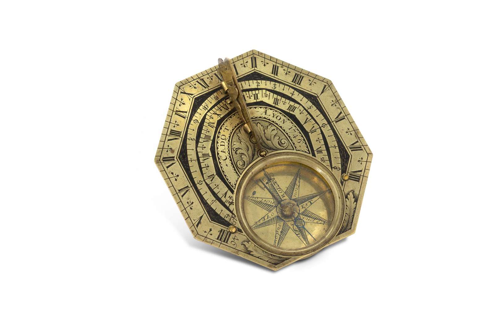 Cadran solaire portatif horizontal en laiton doré de type Butterfield la platine octogonale à trois divisions horaires, gravée de réserves et rinceaux en son centre, signée et datée «Cadot à Lyon 1746», gnomon à l'oiseau, le dos gravé des latitudes de villes européennes, la boussole à huit directions.