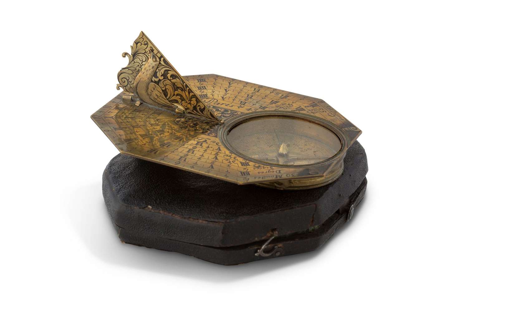 Rare cadran solaire en laiton, ciselé et gravé de rinceaux, la platine octogonale à six divisions horaires signée «Butterfield à Paris», gnomon à l'oiseau. Le revers comportant une soixantaine de latitudes des principales villes européennes incluant Pignerol.