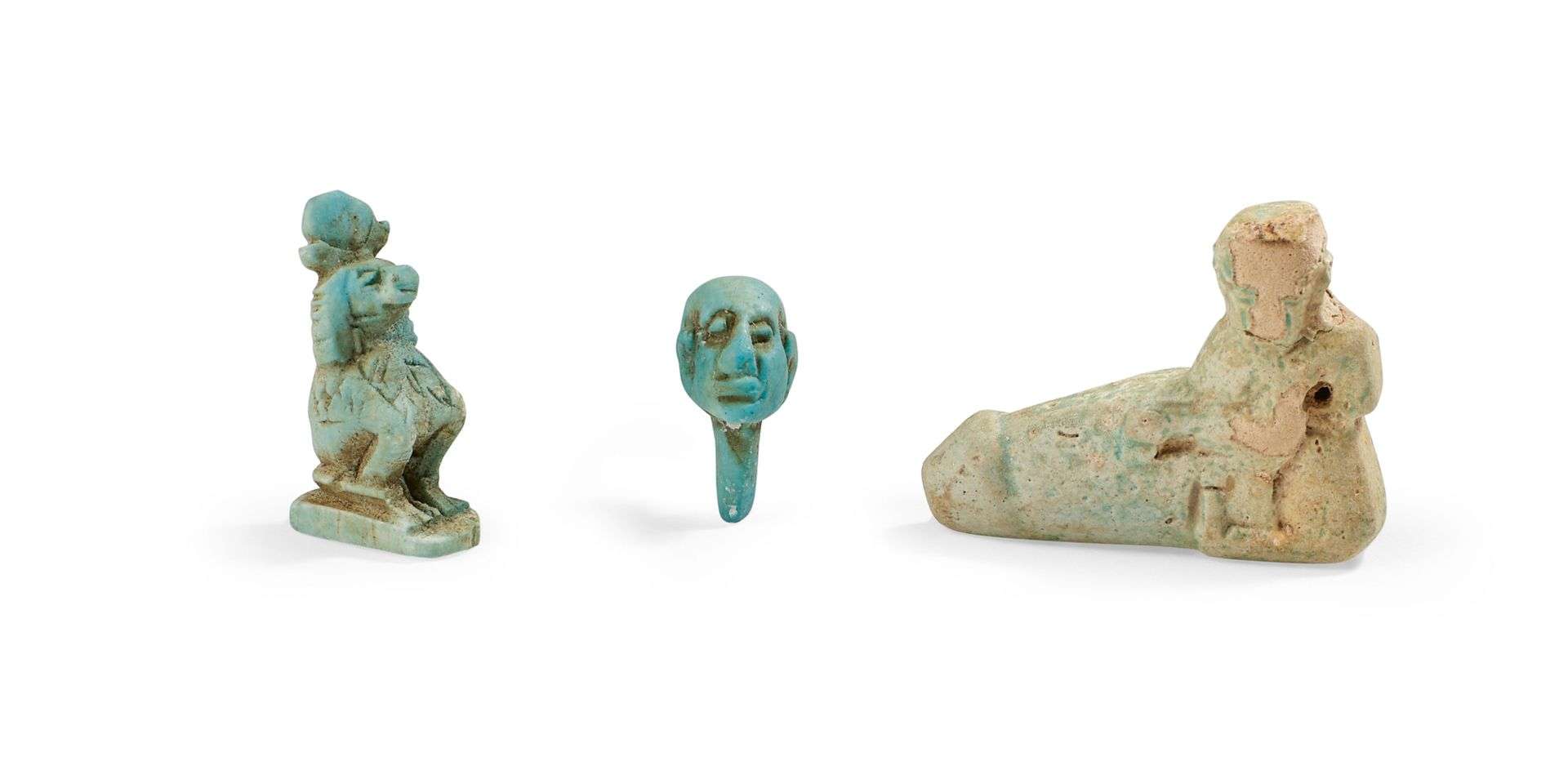 LOT DE TROIS AMULETTES composé de :-Une amulette représentant le dieu Thot-babouin assis, les pattes antérieures posées sur les genoux. Bélière à l'arrière. Faïence siliceuse à glaçure turquoise. Égypte, Basse époque. Hauteur : 2,4 cm