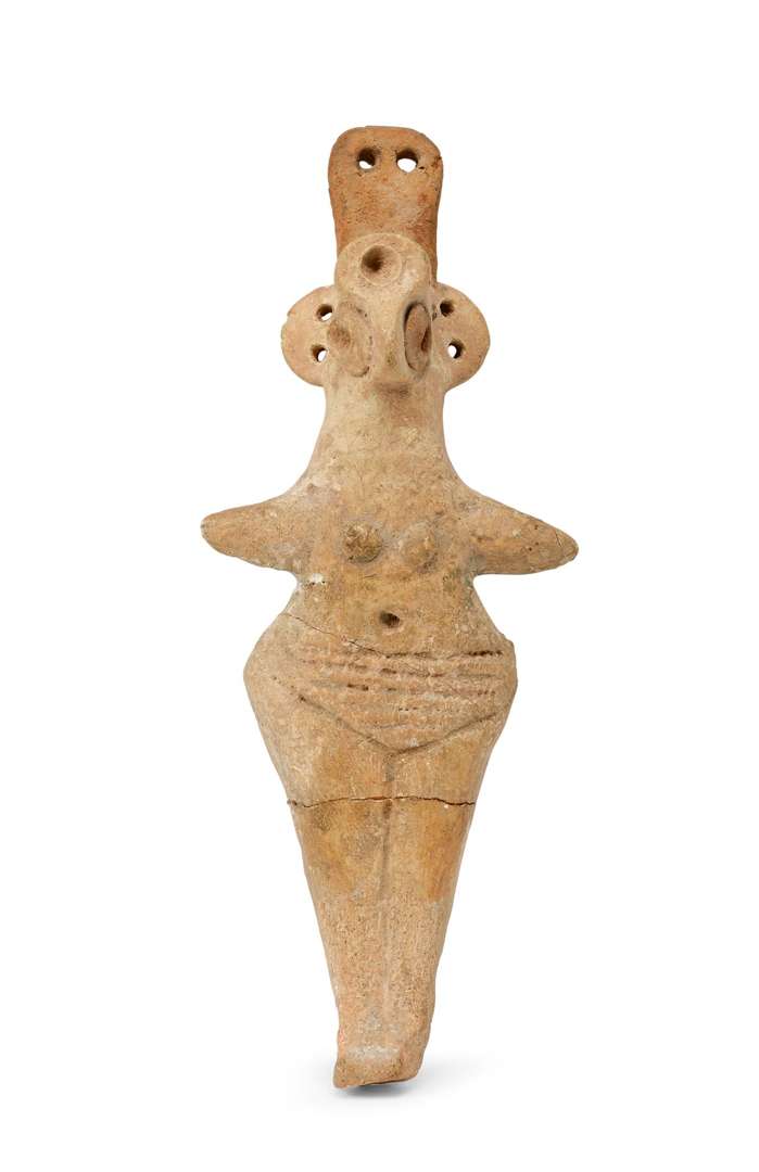 IDOLE FÉMININE en terre cuite. Le corps plat, les bras étendus, la poitrine suggérée. Le visage au nez en bec d'oiseau et aux yeux pastillés. Art syro-hittite, début du IIe millénaire av. J.C.