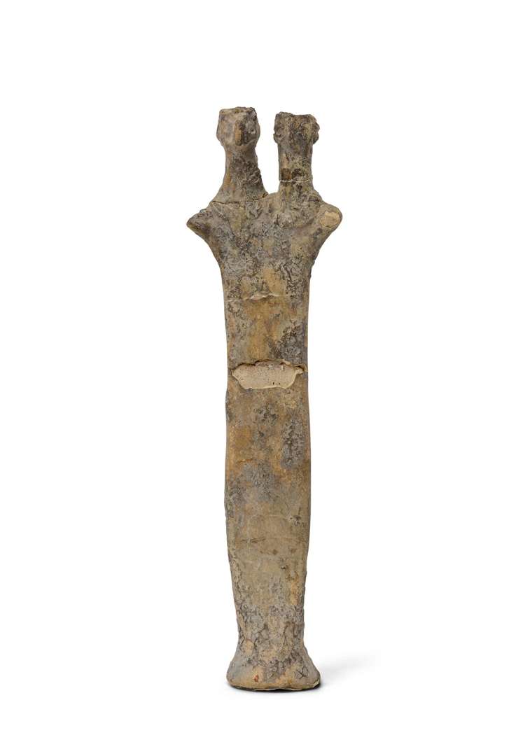 IDOLE BICÉPHALE en terre cuite. Les bras en forme de moignons. Les encolures parées de larges colliers. Les visages aux nez en bec d'oiseau, les yeux en forme de pastilles et les chevelures coiffées d'un catogan. Art syro-hittite, début du IIe millénaire av. J.C.
