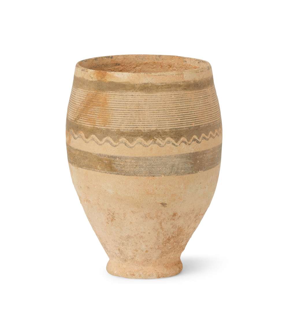GRAND GOBELET ovoïde en terre beige décoré de bandeaux et de filets circulaires et ondoyants de couleur brunâtre. Phénicie, premier millénaire av. J.-C.