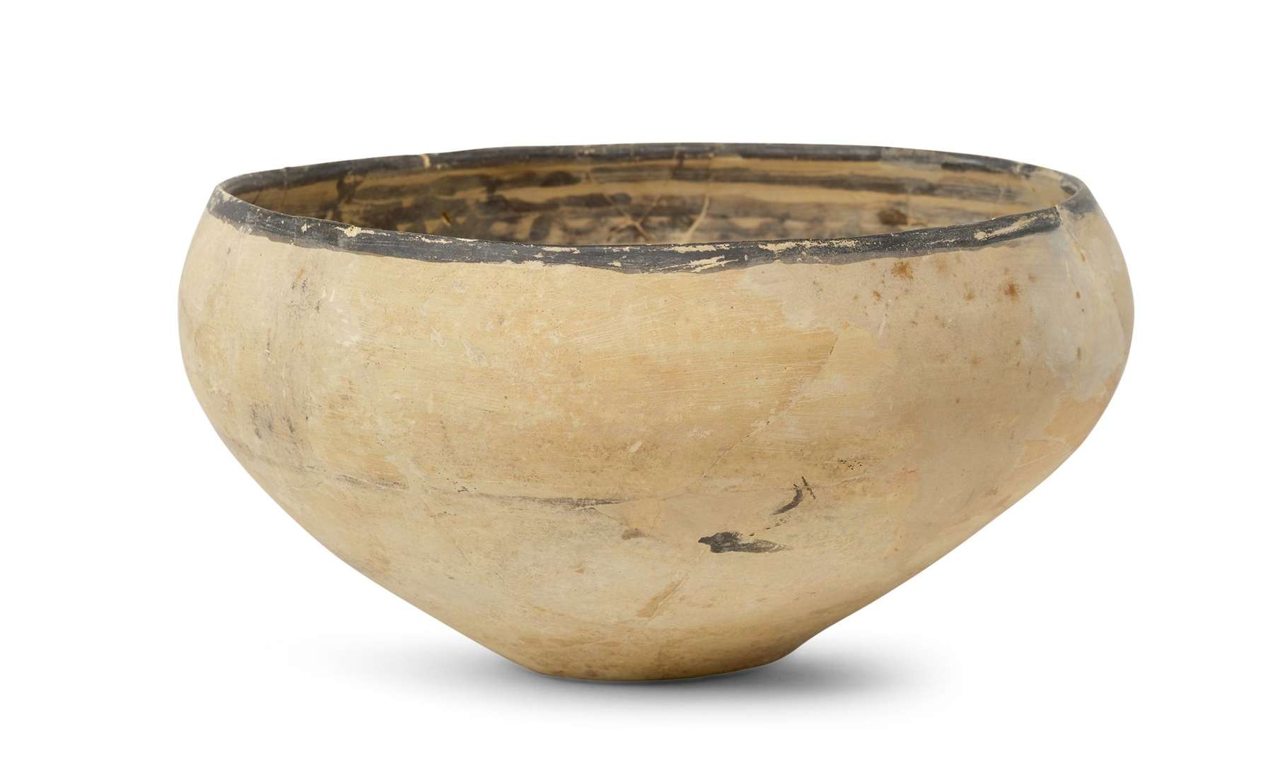 GRAND BOL OVOÏDE en terre cuite à décor peint noir sur fond beige d'un large bandeau sur le pourtour du col. L'intérieur décoré de frises longitudinales sur le pourtour et de triangles formant un motif cruciforme dans le creux. La base de forme aplatie. Iran, II-IIIe millénaire av. J.-C.