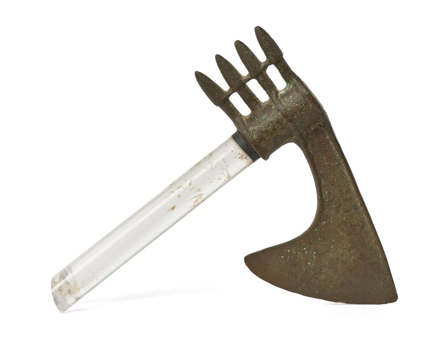 HACHE DIGITÉE en bronze. La lame incurvée et la douille tubulaire annelée à quadruple digitations coniques. Luristan, début du Ier millénaire av. J.-C.