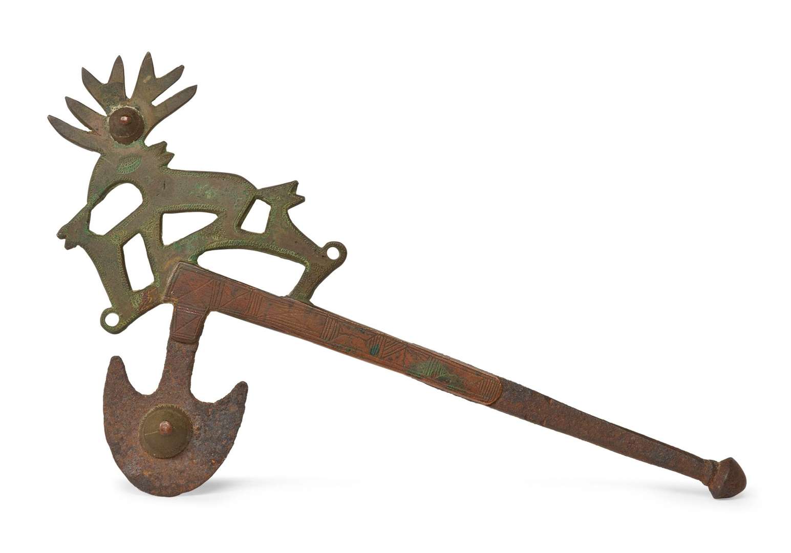 HACHETTE RITUELLE en cuivre, bronze et fer représentant un cerf attaqué pa