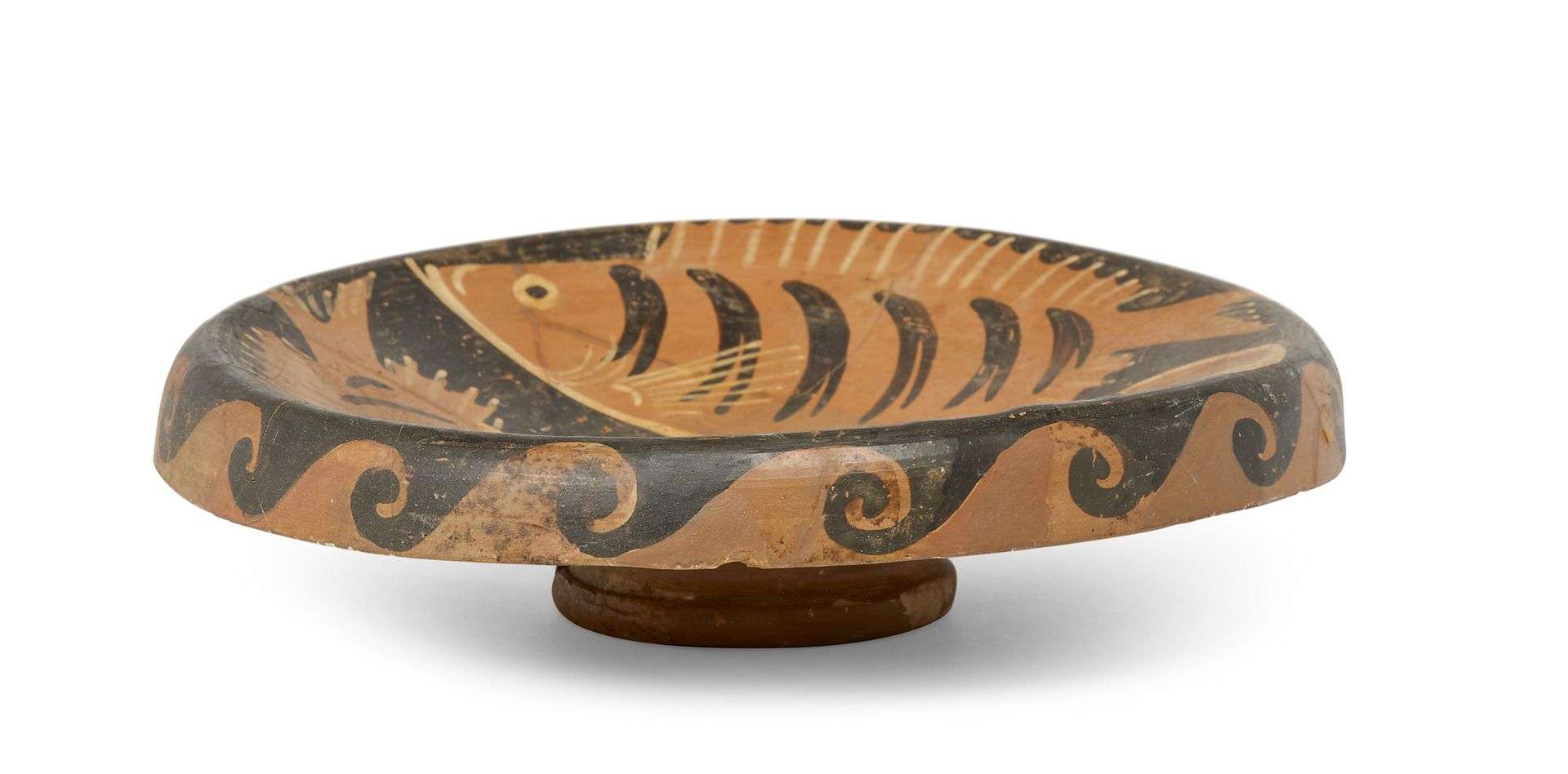 PLAT AUX POISSONS légèrement creux, sur pied, en terre rouge et fond noir décoré de trois poissons de couleur brun clair, rehauts blancs. Frise de vagues stylisées sur le côté. Grèce, Ve-IIIe siècle av. J.-C.