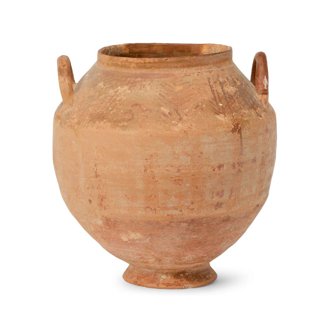 JARRE OVALE À DEUX ANSES en terre cuite brune, dans la partie supérieure traces d'un décor en partie effacé : oiseau, roseaux, animal (?)