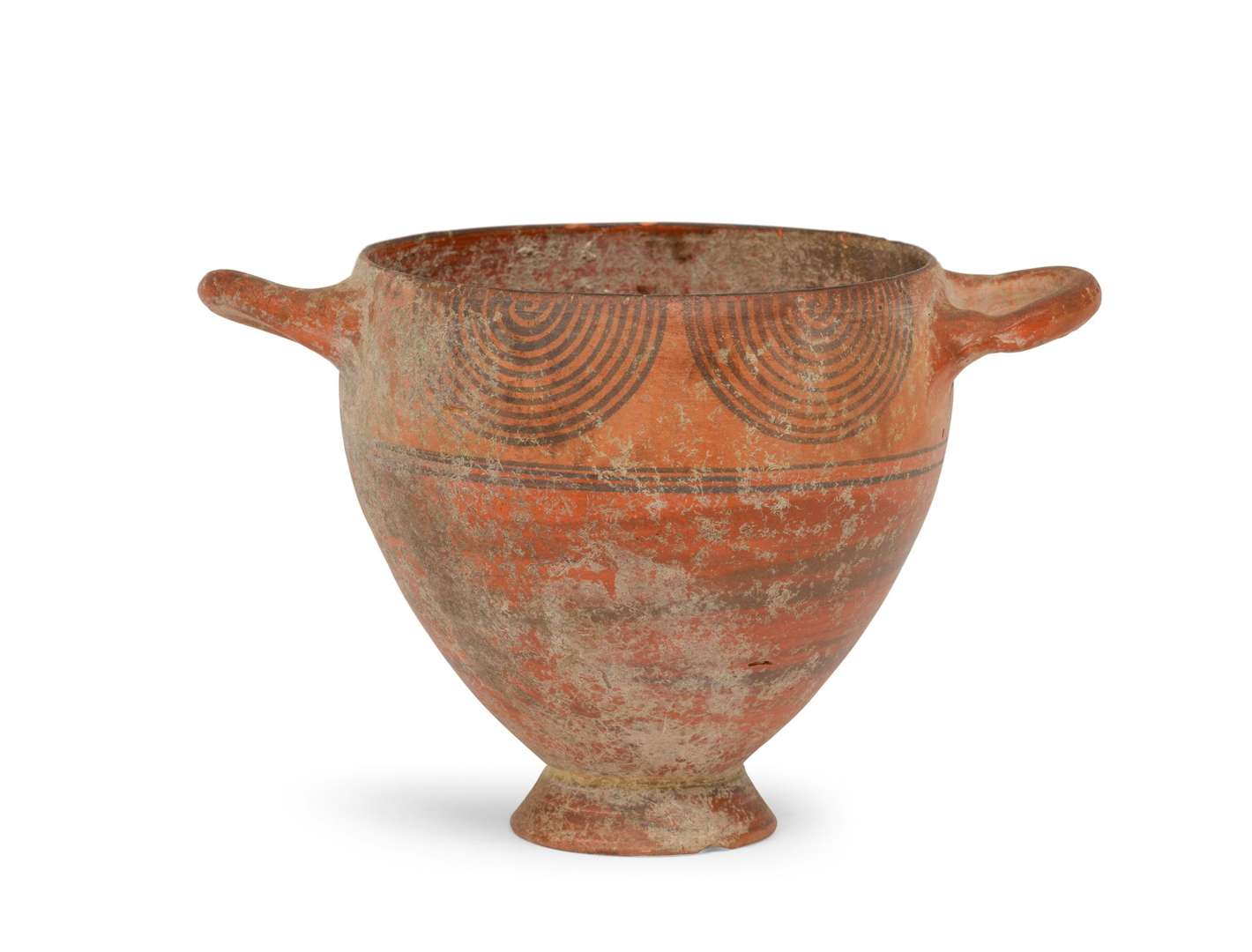 COUPE À DEUX ANSES SUR PIED CONIQUE décor peint de quatre demi-cercles, symboles de disque solaire, peints en noir sur le pourtour supérieur et bandeaux peints en noir sur la panse. Terre cuite vernissée rouge orangée. Grande Grèce, Ve siècle av. J.-C.