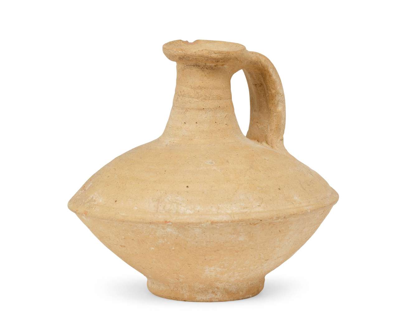 CRUCHE À ANSE CARÉNÉE en terre cuite de couleur beige clair. Probablement Antiquité, bassin méditérranéen.